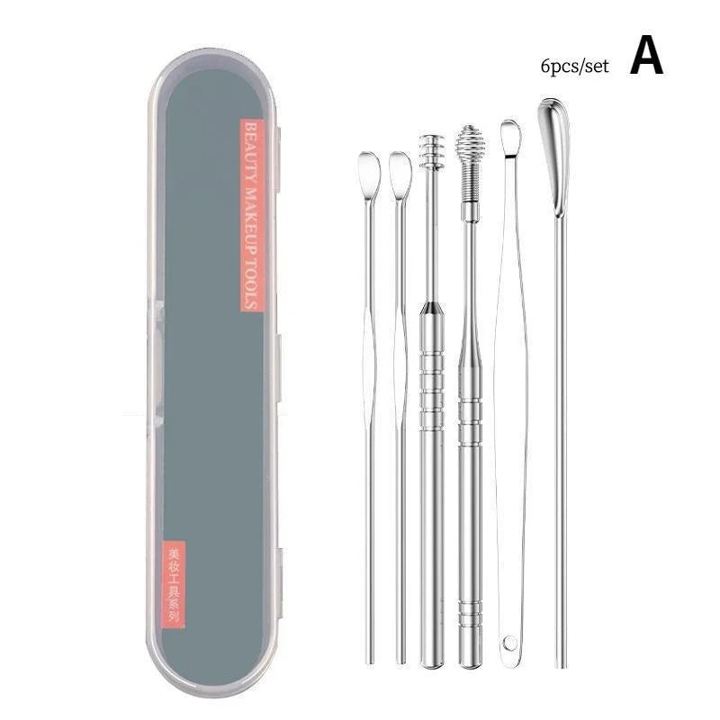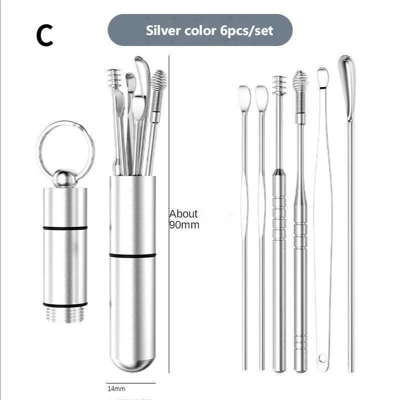 - Contenu : Plusieurs instruments essentiels pour le soin des oreilles, incluant une curette, une pince à épiler, un cure-oreille spirale et une brosse de nettoyage